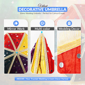 Add color and charm to your event setup with this Decorative Velvet Umbrella, perfect for weddings, mehndi, mayoun, or festive displays. Covered in soft velvet fabric with detailed accents, it serves as a beautiful centerpiece or backdrop element.