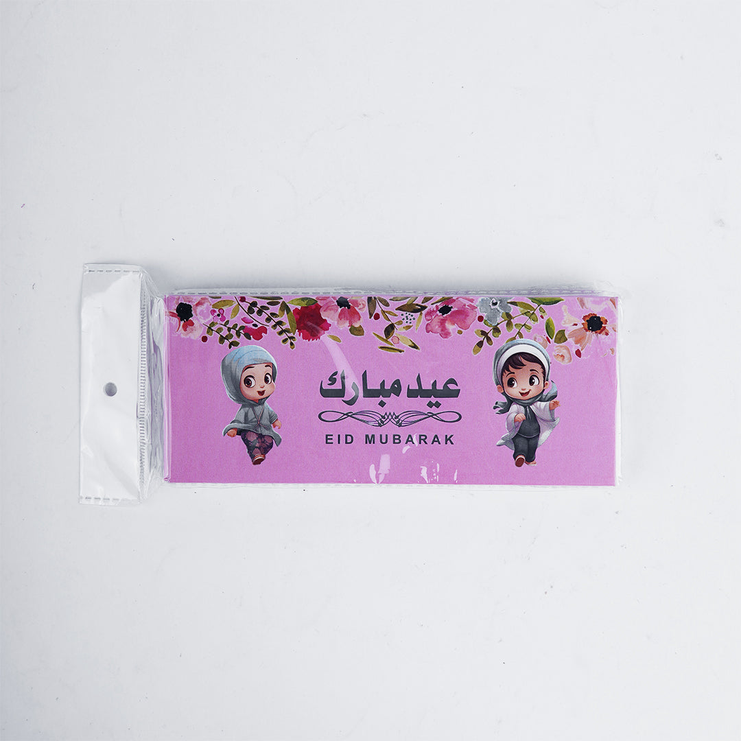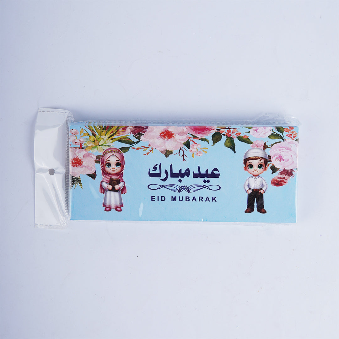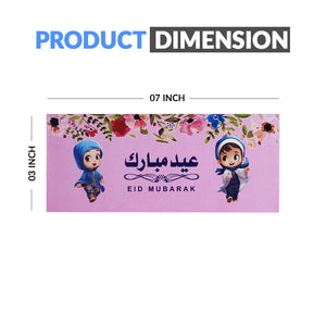 A set of 10 Eid Mubarak Envelopes is offered in three vibrant colors: yellow, pink, and sky blue.